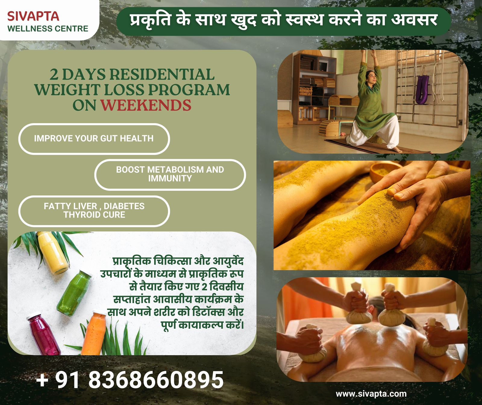 If you want a natural weight loss program in Delhi NCR, the 2 Days Residential Weekend Weight Loss Program at Sivapta Wellness Centre, Noida is the best choice. With a holistic blend of Ayurveda, Yoga, Detox, and Meditation, this program helps you lose weight, restore health, and rejuvenate your body—all in just one weekend.